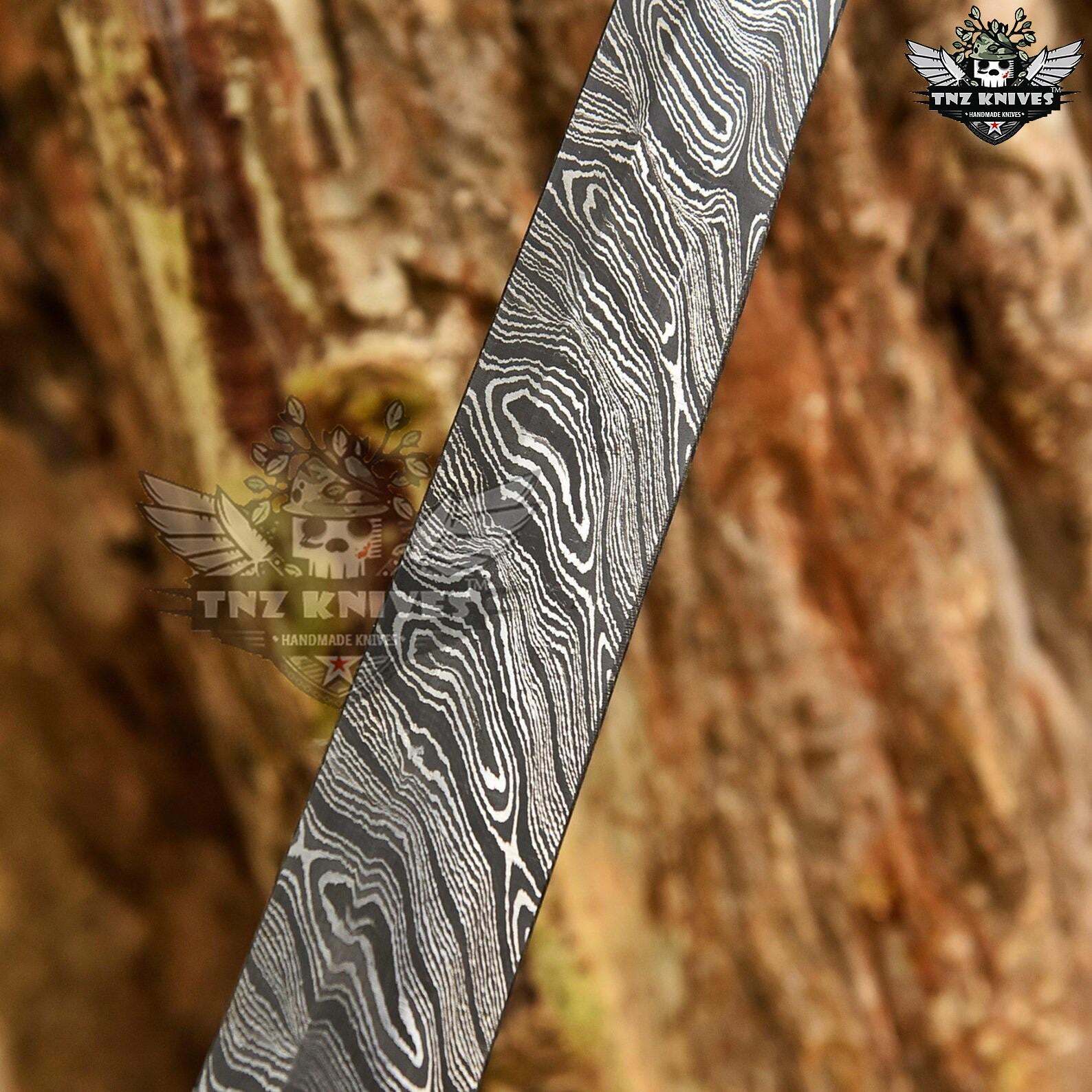 Crafted from high-quality Damascus steel, the 28-inch blade showcases beautiful natural patterning created through traditional forging techniques. The layered steel not only enhances durability but also gives each piece a unique wave pattern — no two are exactly alike.